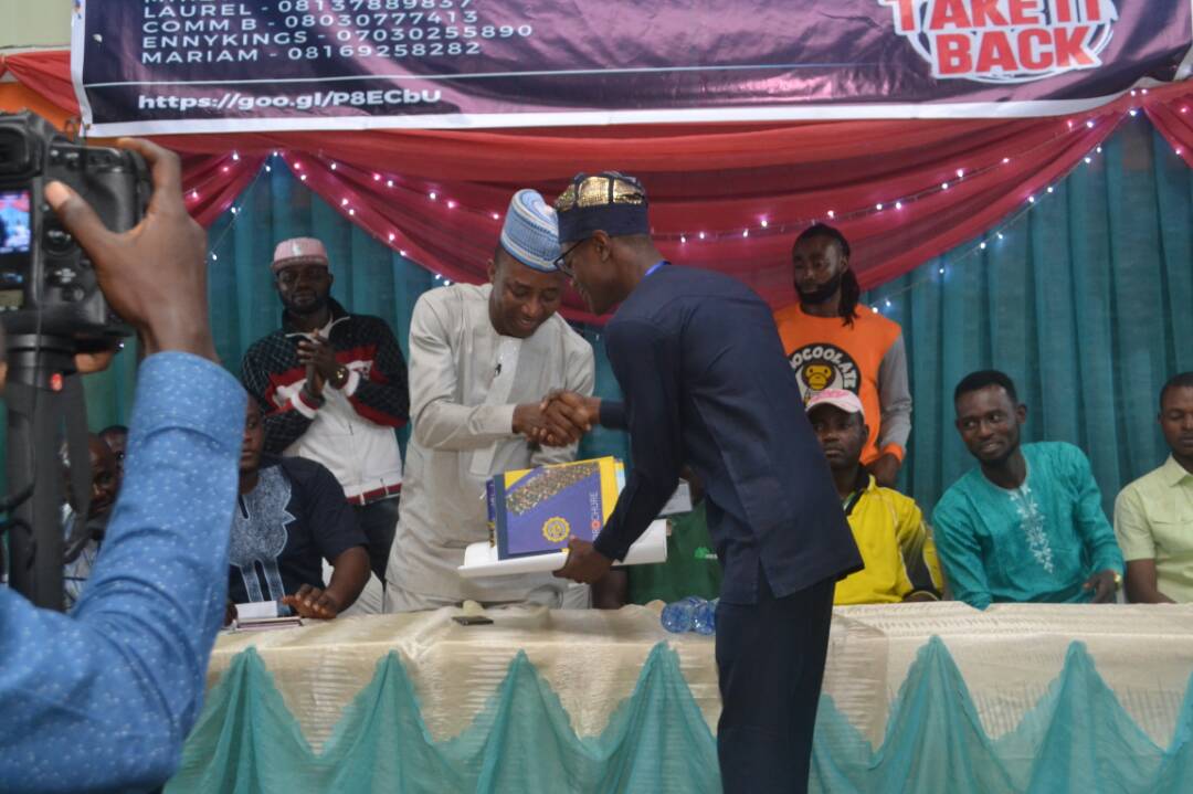 | Tomiwa Fadeyi presents Adeleke University's souvenirs to Sowore (left), at the event. |